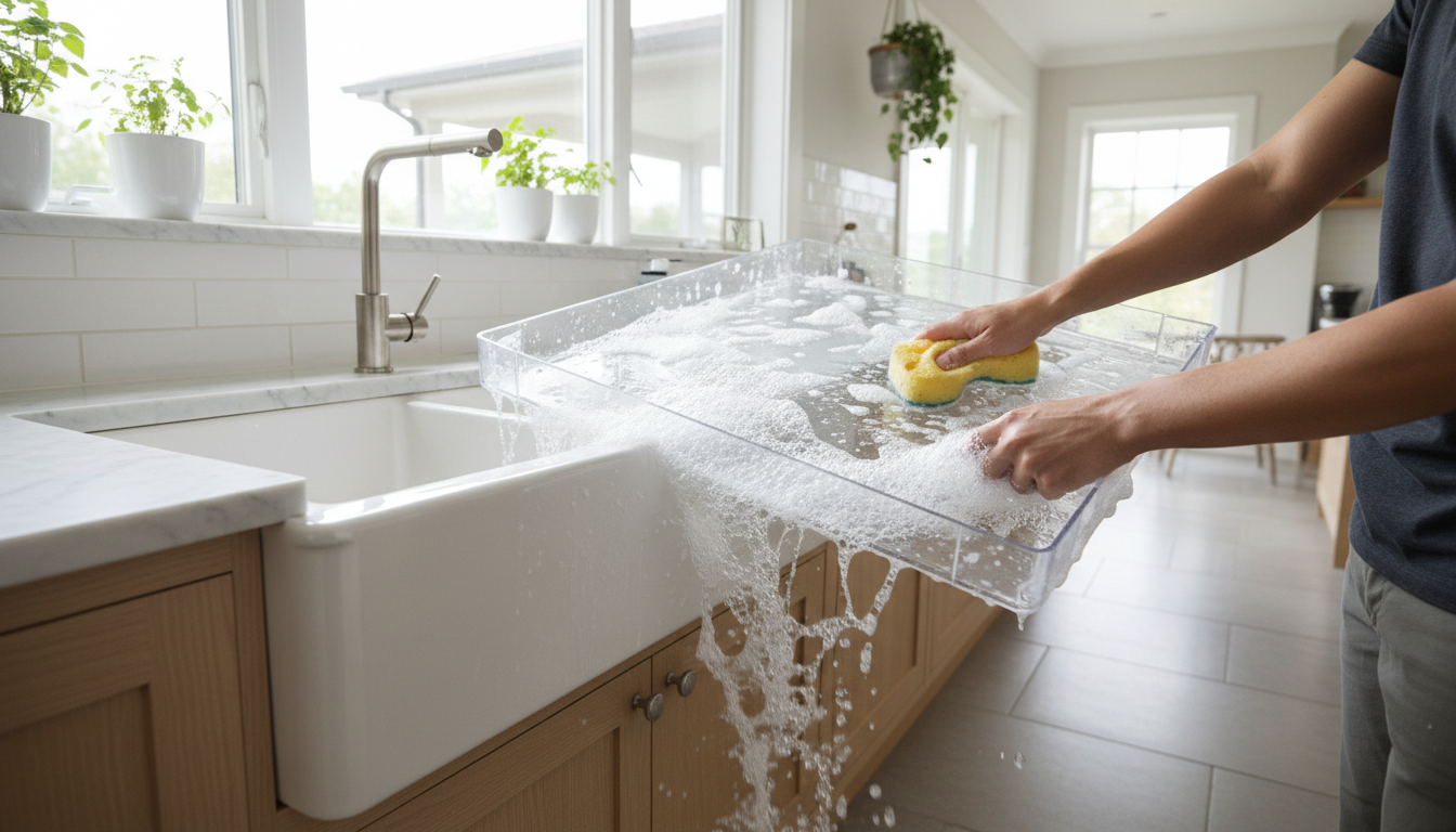 청소 시작 1~2시간 전에 전원을 끄거나 성에 제거 모드를 작동시킨 뒤, 문을 열어두어 자연스럽게 녹게 하세요. 이때 날카로운 칼이나 도구로 성에를 억지로 떼어내면 냉매 배관이 손상되어 냉장고를 아예 못 쓰게 될 수 있으니 절대 금물입니다. 따뜻한 물을 분무기에 담아 뿌려주거나 뜨거운 물을 담은 그릇을 잠시 넣어두면 훨씬 안전하고 빠르게 성에를 녹일 수 있습니다.